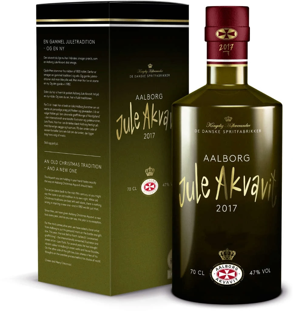 Aalorg Jule Akvavit 2017 stammt aus Dänemark und ist nicht nur etwas Besonderes für Genießer, sondern auch ein Favorit für viele Sammler. Denn dieser wird nur in limitierter Stückzahl produziert und zieht den Betrachter mit der Farbmischung aus tannengrün, kühnem Schriftzug und rotem Verschluss in seinen Bann. Mit 47 Volumen Alkoholgehalt bringt er zusätzlich einen Geschmack von feinsten Kräutern und Gewürzen mit, die den einzigartigen Duft und Geschmack des Aalborg prägen.