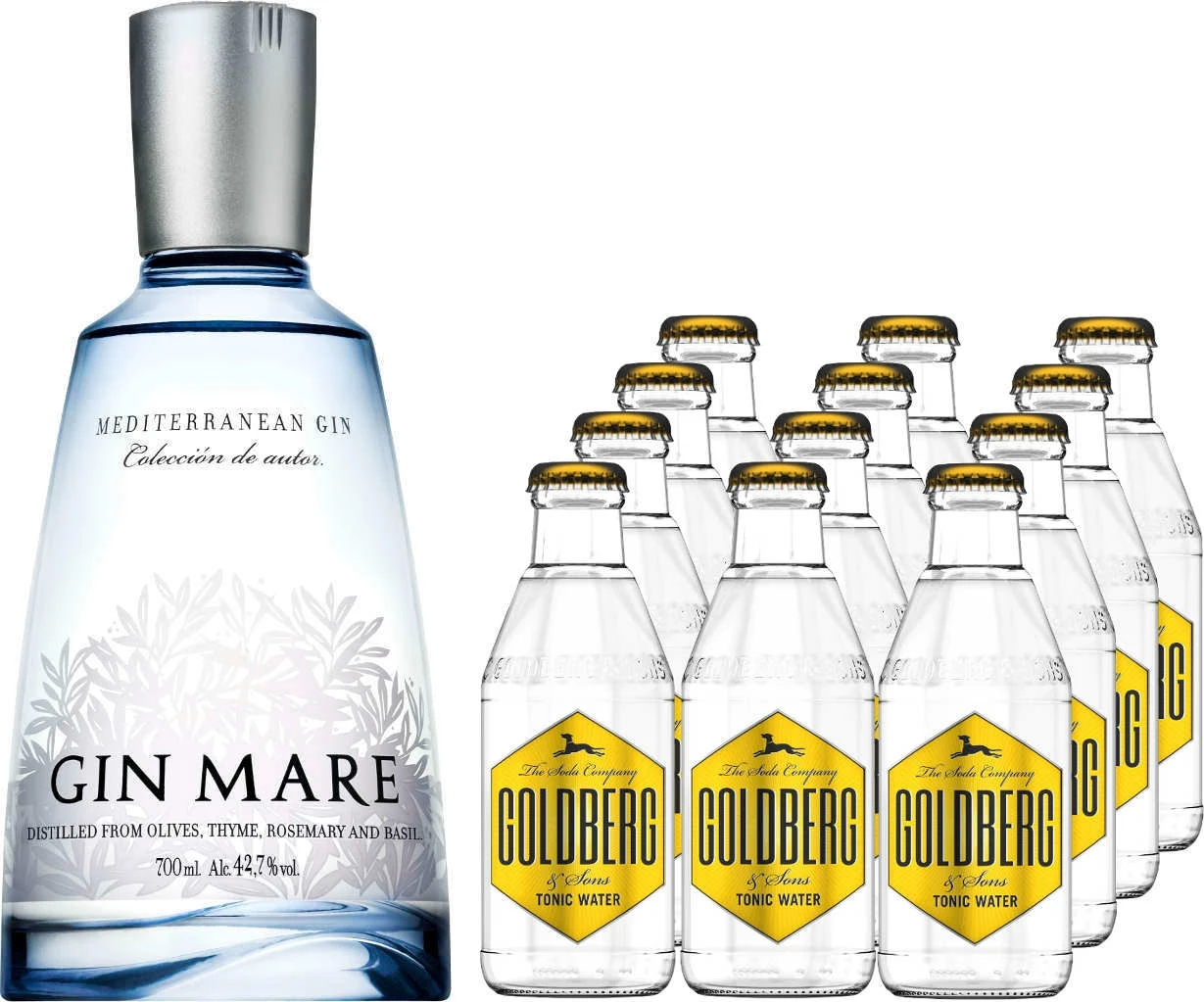 Gin von Gin Mare in einer 0,7l Flasche mit 42,7% Alc. und 12x Limonade von Goldberg in 0,2l Flaschen mit Farbstoff, zzgl. 1,20 € Pfand