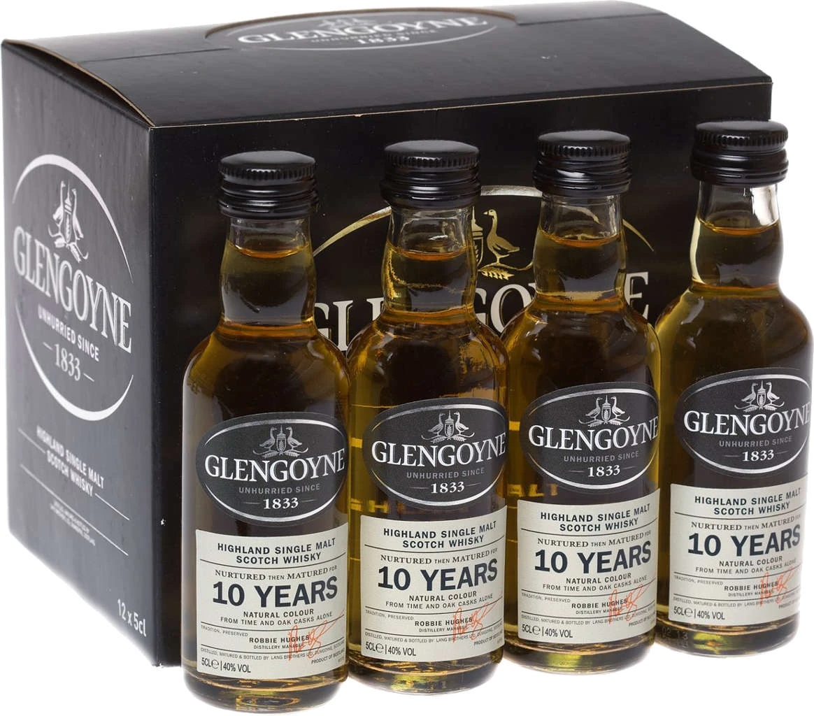 Whisky von Glengoyne in 3×0,05 liter Flaschen mit bis zu 40% Vol. Alc. mit Farbstoff