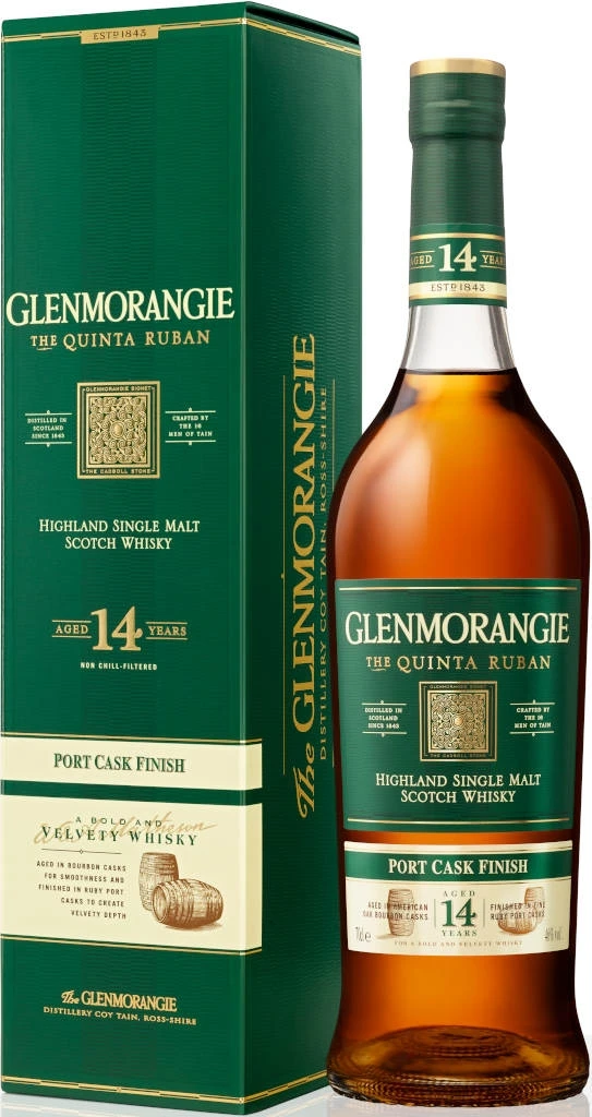 Der Single Malt Whisky reift zunächst in edlen Bourbonfässern. Durch die Nachreifung in Portweinfässern des portugiesischen Weinguts Quinta erhält der Glenmorangie seine besondere Farbe. Der Geschmack des Whisky ist von Schokoladen- und Zitrusnoten geprägt. Am Gaumen zeigt der Quinta Ruban seinen seidigen, reichen Charakter mit einer feinen Süße und trockenen Zwischentönen. Das Finish wird von dem Gegensatz zwischen herber Bitterschokolade und frischer Minze bestimmt.