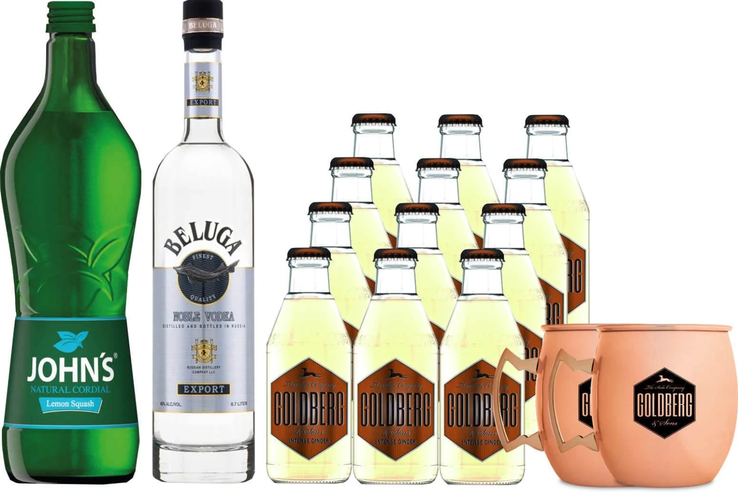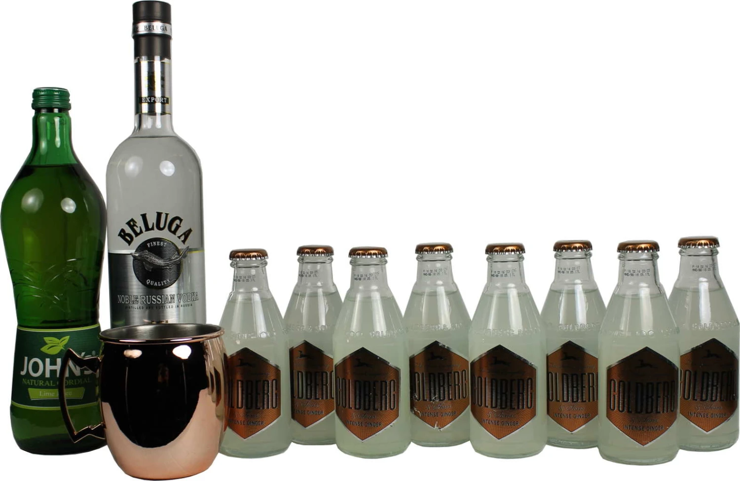 Dieses Set besteht aus seiner Flasche des hochwertigen Beluga Noble Vodkas, einer Flasche Johns Lime Cordial und 6 Flaschen Goldberg Ginger Intense. Dazu gibt es einen stilechten Kupferbecher mit dazu.