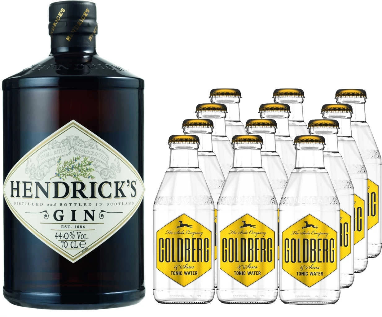 Hendricks Gin in einer 0,7 L Flasche mit 41,4% Alc. und 12x Limonade von Goldberg in 0,2l Flaschen mit Farbstoff, zzgl. 1,20 € Pfand