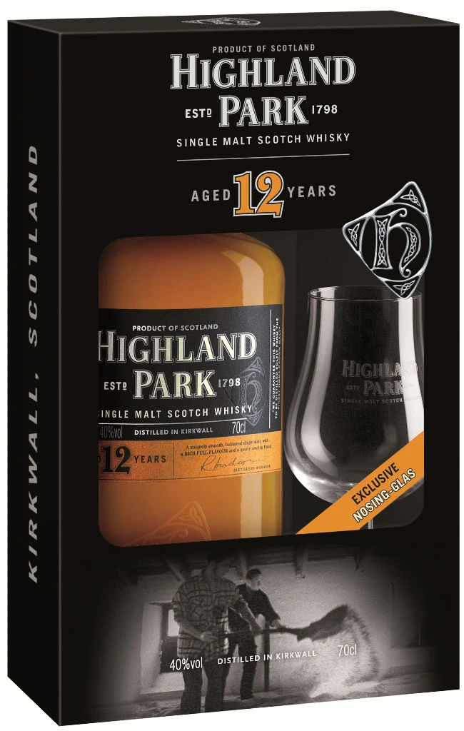 Highland Park 12 Jahre in Geschenkpackung mit Nosingglas – ein schottischer Single Malt Whisky aus der traditionsreichen und weltbekannten Distillery in Kirkwall auf den Orkney Islands. Über 200 Jahre Erfahrung in der Whiskyherstellung und einzigartige klimatische Einflüsse sind Grundlage der Rohstoffverarbeitung für diesen unverwechselbaren Malt Whisky. Alle Highland Park Whiskys bestechen durch süßlich-fruchtige Noten mit Torf- und Honignoten.