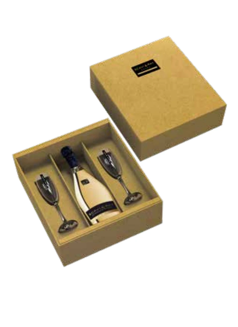 Set Golden Dreams von Scavi & Ray bestehend aus einer Flasche Prosecco Momento D’oro Spumante 0,75l und zwei Prosecco Gläsern