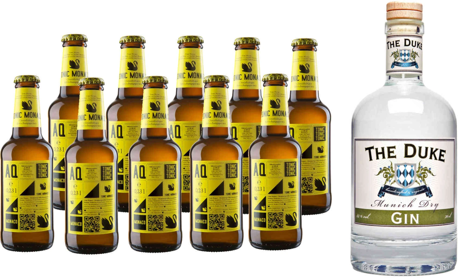 Gin von The Duke in 0,7l Flasche mit 45 %Vol. Alc. und 10x Tonic Water von Aqua Monaco zzgl. 1,50 € Pfand