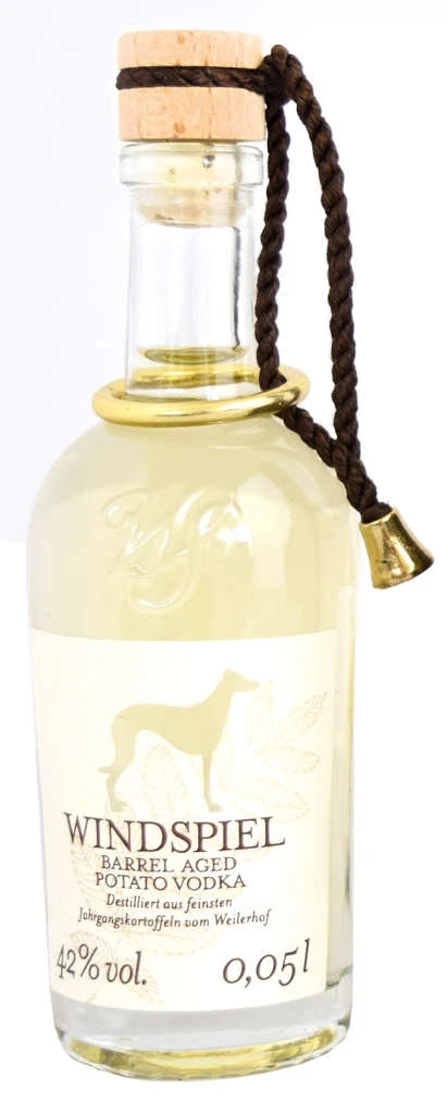 Fassgelagerter Vodka von Windspiel in der 5cl Flasche mit 42% Vol. Alc. und Farbstoff